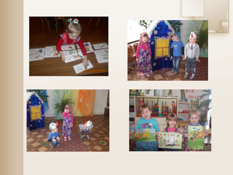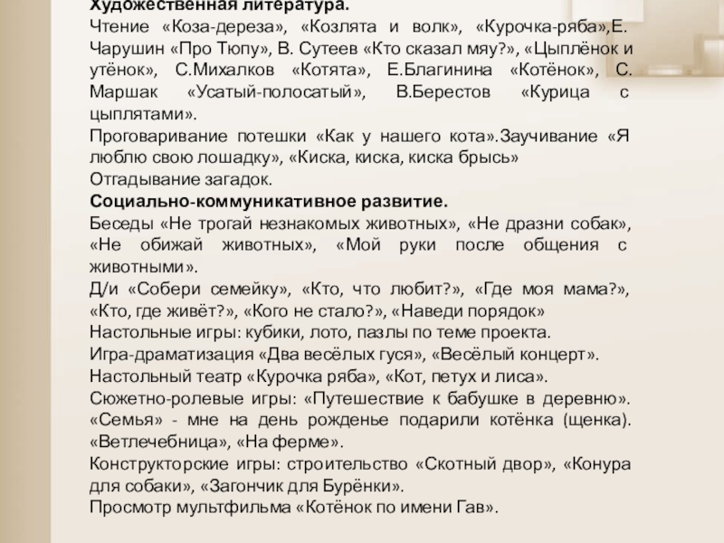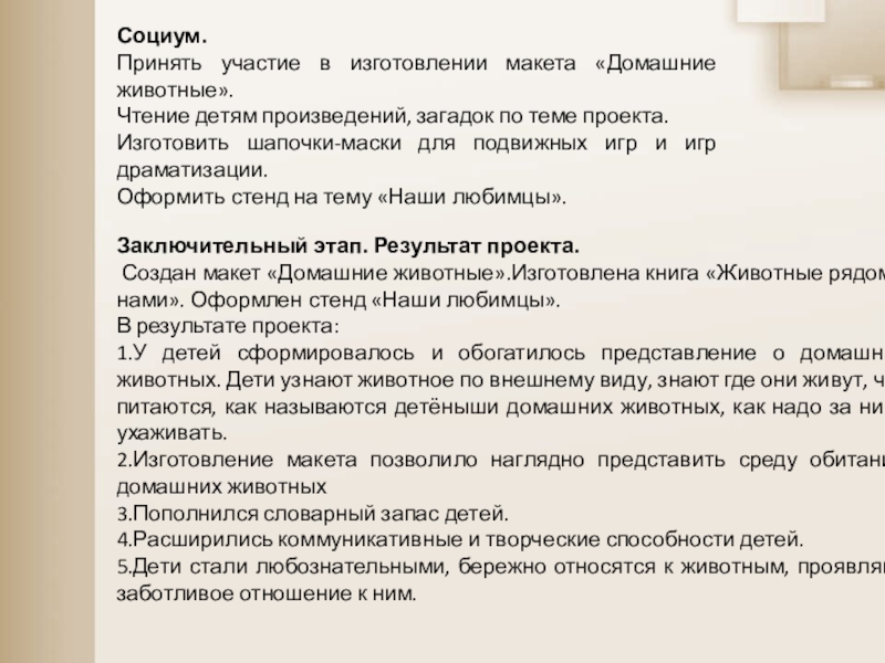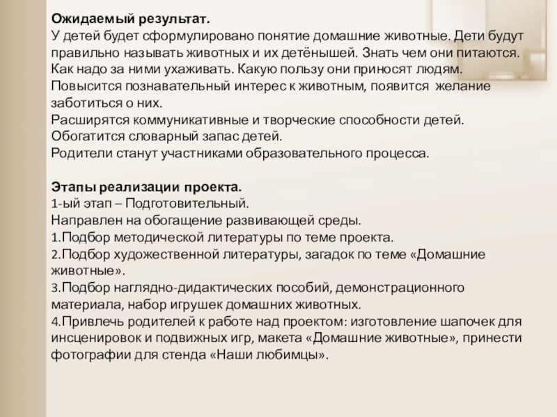4.Привлечь родителей к работе над проектом: изготовление шапочек для инсценировок и подвижных игр, макета «Домашние животные», принести фотографии для стенда «Наши любимцы».
