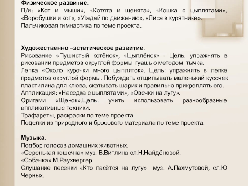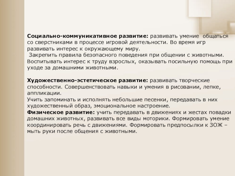 Физическое развитие: учить передавать в движениях и жестах повадки домашних животных, развивать все виды моторики. Формировать умение координировать речь с движениями. Формировать предпосылки к ЗОЖ – мыть руки после общения с животными.