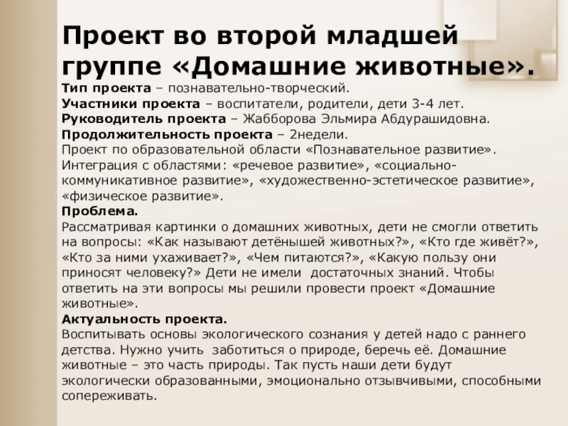 Воспитывать основы экологического сознания у детей надо с раннего детства. Нужно учить заботиться о природе, беречь её. Домашние животные – это часть природы. Так пусть наши дети будут экологически образованными, эмоционально отзывчивыми, способными сопереживать.