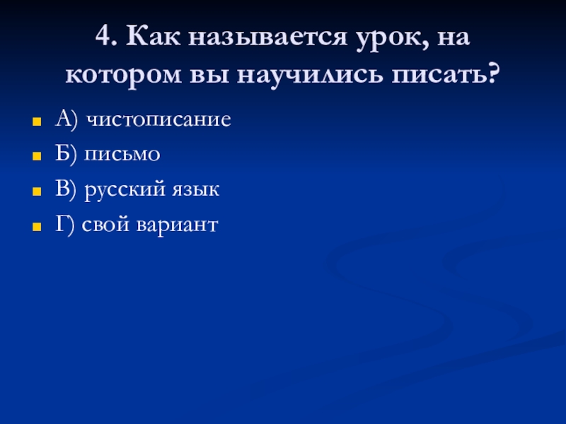 4. Как называется урок, на котором вы научились писать?А) чистописаниеБ) письмоВ) русский языкГ) свой вариант