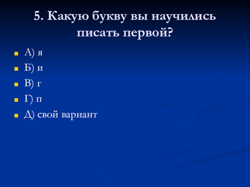 5. Какую букву вы научились писать первой?А) яБ) иВ) гГ) пД) свой вариант