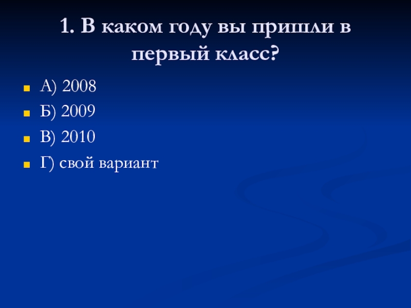 1. В каком году вы пришли в первый класс?А) 2008Б) 2009В) 2010Г) свой вариант