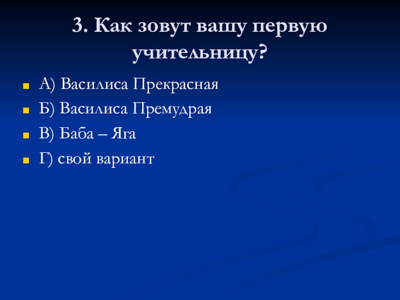 3. Как зовут вашу первую учительницу?А) Василиса ПрекраснаяБ) Василиса ПремудраяВ) Баба – ЯгаГ) свой вариант