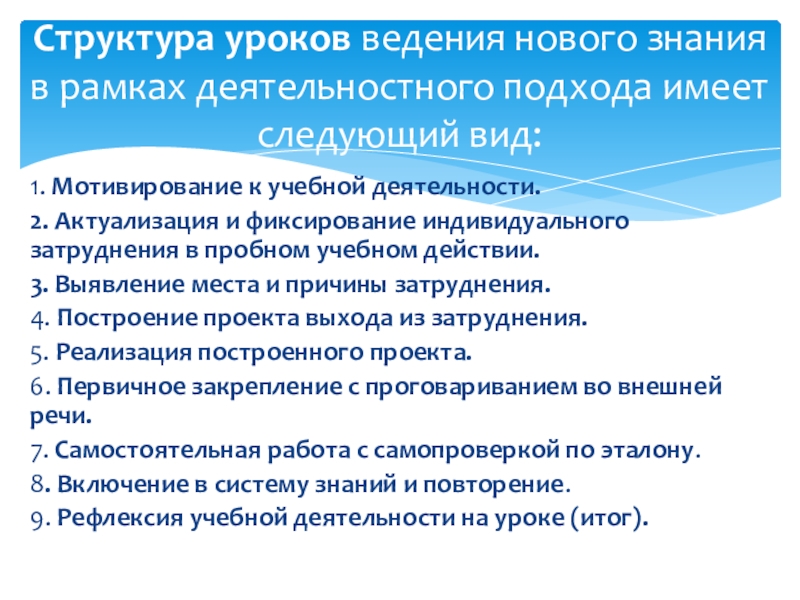 Структура уроков ведения нового знания в рамках деятельностного подхода имеет следующий вид: