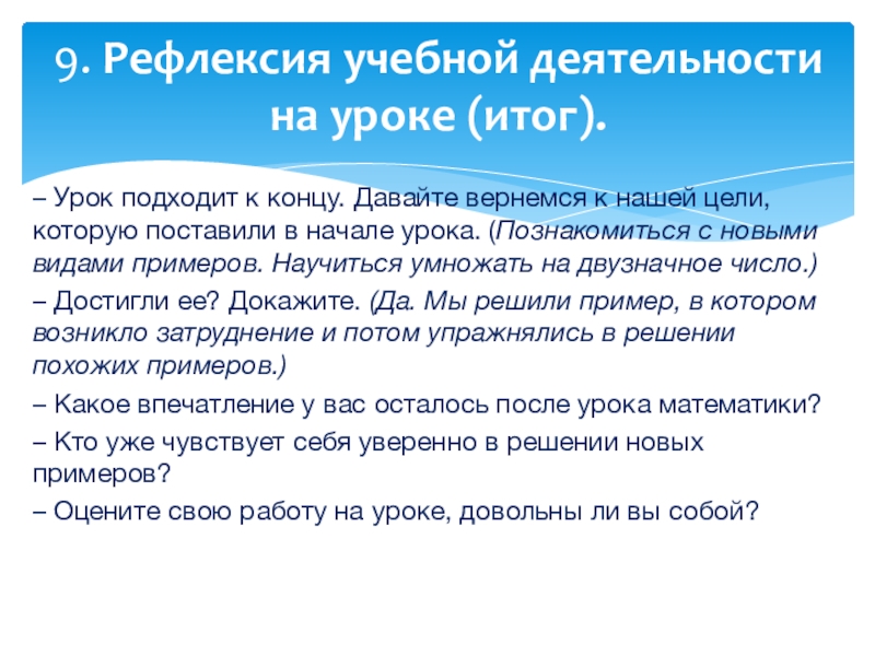 9. Рефлексия учебной деятельности на уроке (итог).