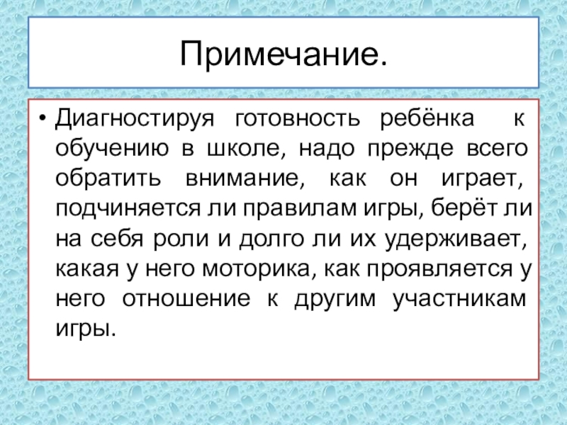 Примечание.Диагностируя готовность ребёнка к обучению в школе, надо прежде всего обратить внимание, как он играет, подчиняется ли