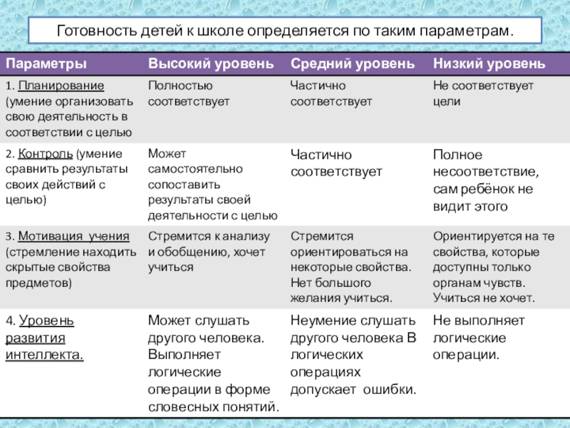 Слайд 7Готовность детей к школе определяется по таким параметрам.