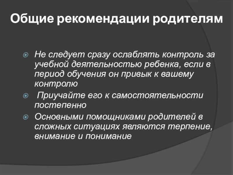 Не следует сразу ослаблять контроль за учебной деятельностью ребенка,