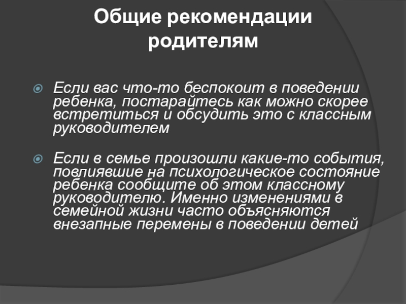 Если в семье произошли какие-то события, повлиявшие на психологическое состояние ребенка сообщите об этом классному руководителю. Именно изменениями в семейной жизни часто объясняются внезапные перемены в поведении детей