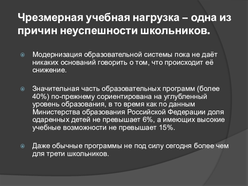 Слайд 15Чрезмерная учебная нагрузка – одна из причин неуспешности школьников.