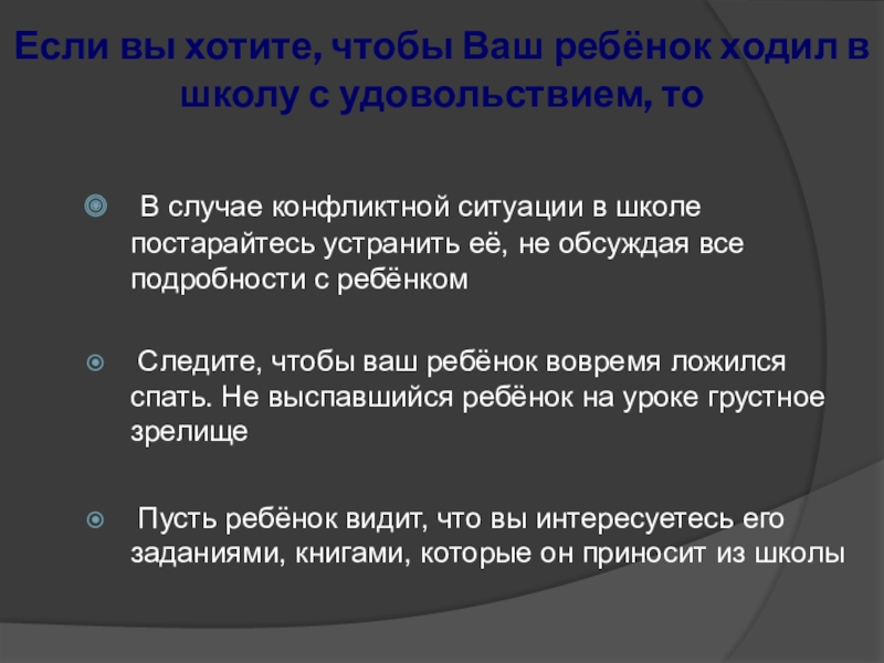 Слайд 24Если вы хотите, чтобы Ваш ребёнок ходил в школу с удовольствием,