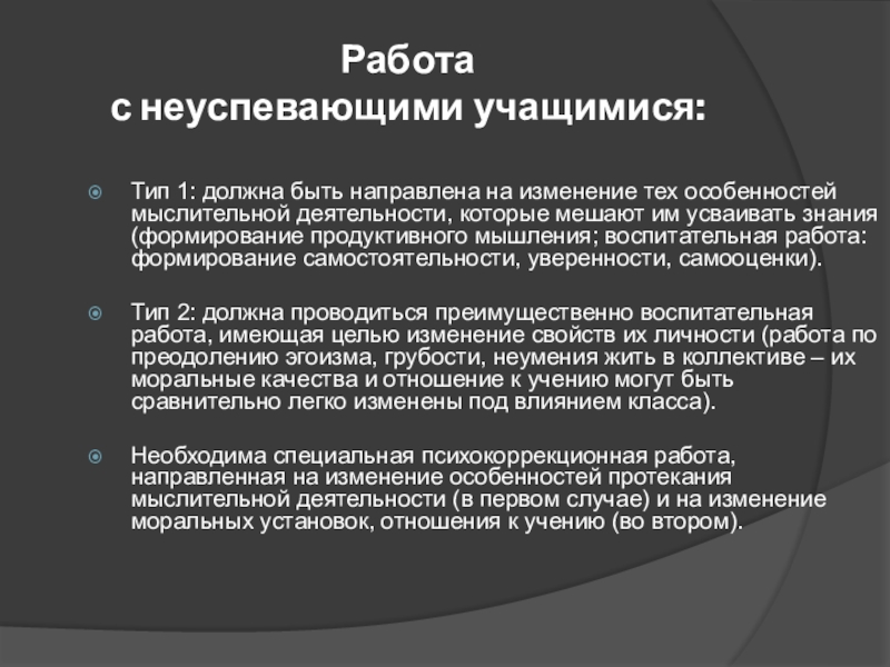 Необходима специальная психокоррекционная работа, направленная на изменение особенностей протекания мыслительной деятельности (в первом случае) и на изменение моральных установок, отношения к учению (во втором).