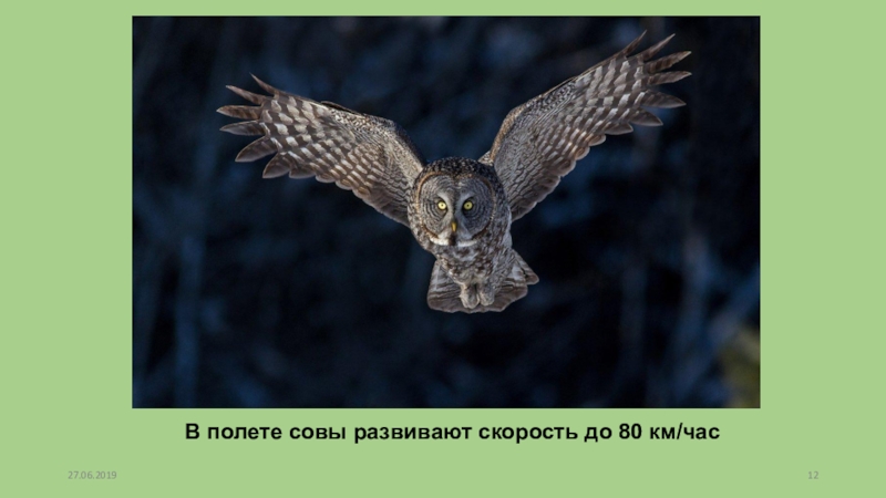 Слайд 12В полете совы развивают скорость до 80 км/час