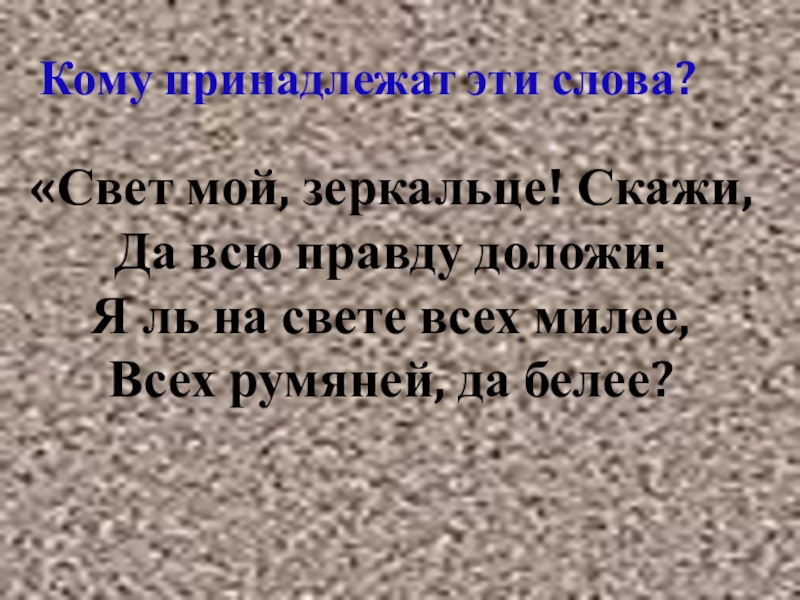 Кому принадлежат эти слова?«Свет мой, зеркальце! Скажи,Да всю правду доложи:Я ль на свете всех милее,Всех румяней, да