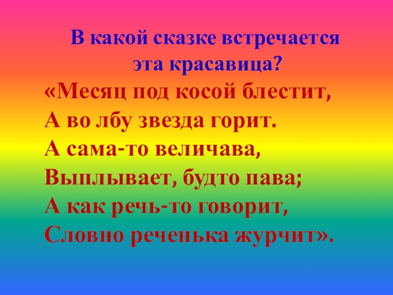 В какой сказке встречается эта красавица?«Месяц под косой блестит,А во лбу звезда горит.А сама-то величава,Выплывает, будто пава;А