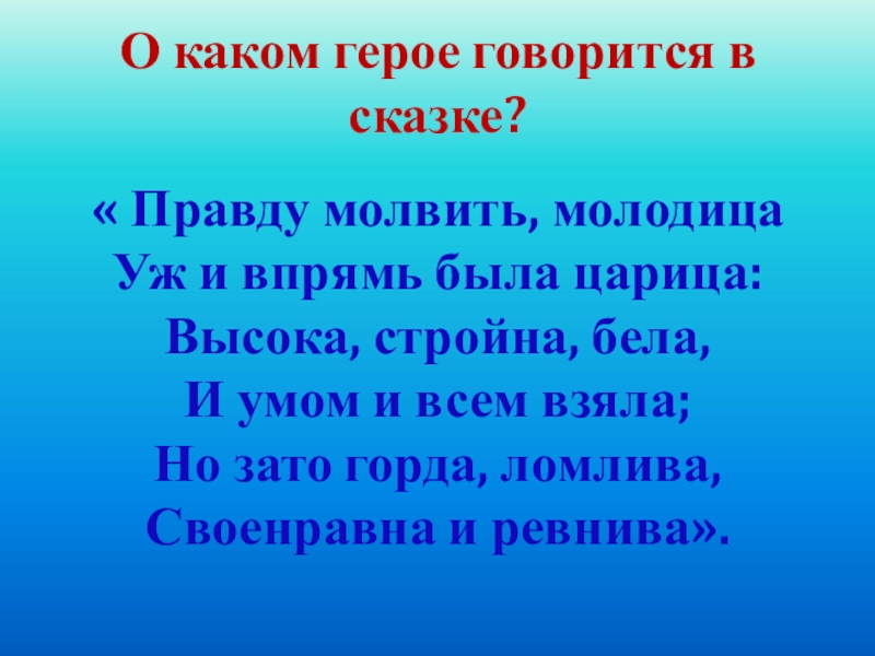 О каком герое говорится в сказке?« Правду молвить, молодицаУж и впрямь была царица:Высока, стройна, бела,И умом и