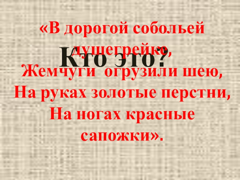 Кто это?«В дорогой собольей душегрейке,Жемчуги огрузили шею,На руках золотые перстни,На ногах красные сапожки».