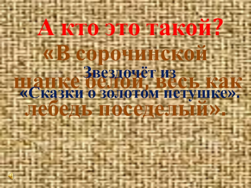 А кто это такой?«В сорочинской шапке белой, весь как лебедь поседелый».Звездочёт из «Сказки о золотом петушке».
