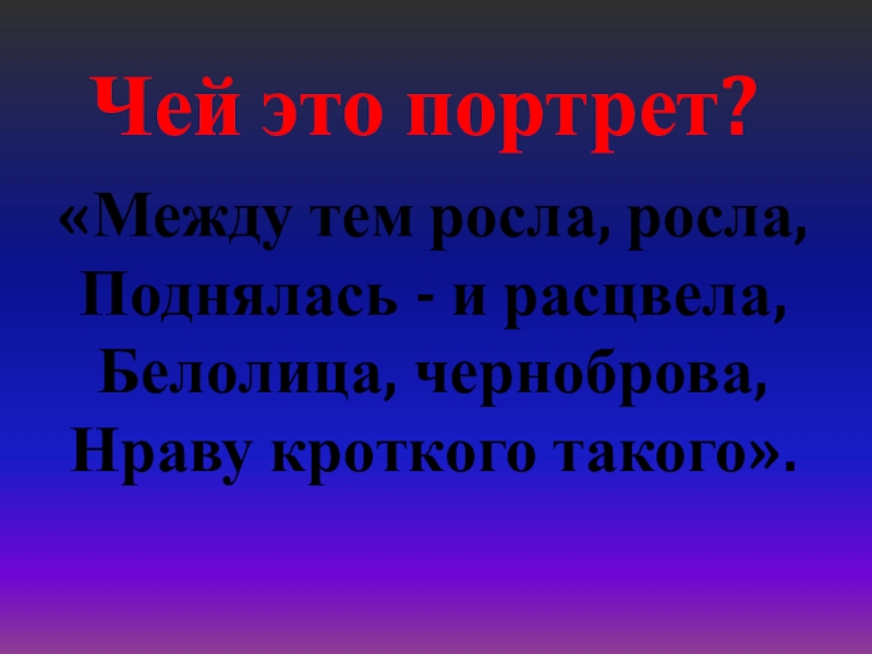 Чей это портрет?«Между тем росла, росла,Поднялась - и расцвела,Белолица, черноброва,Нраву кроткого такого».