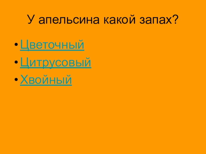 У апельсина какой запах?ЦветочныйЦитрусовыйХвойный