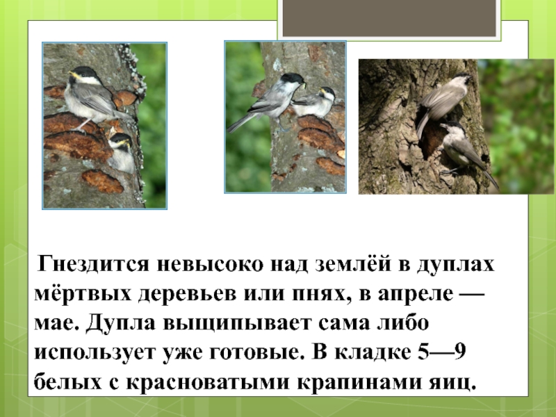Слайд 13 Гнездится невысоко над землёй в дуплах мёртвых деревьев или пнях,