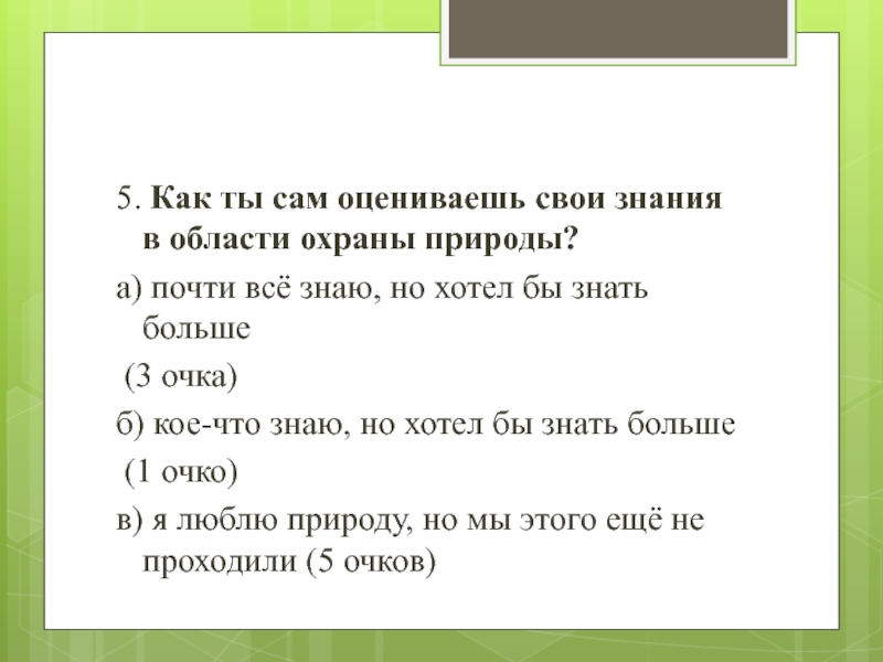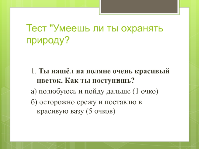Слайд 20Тест "Умеешь ли ты охранять природу?