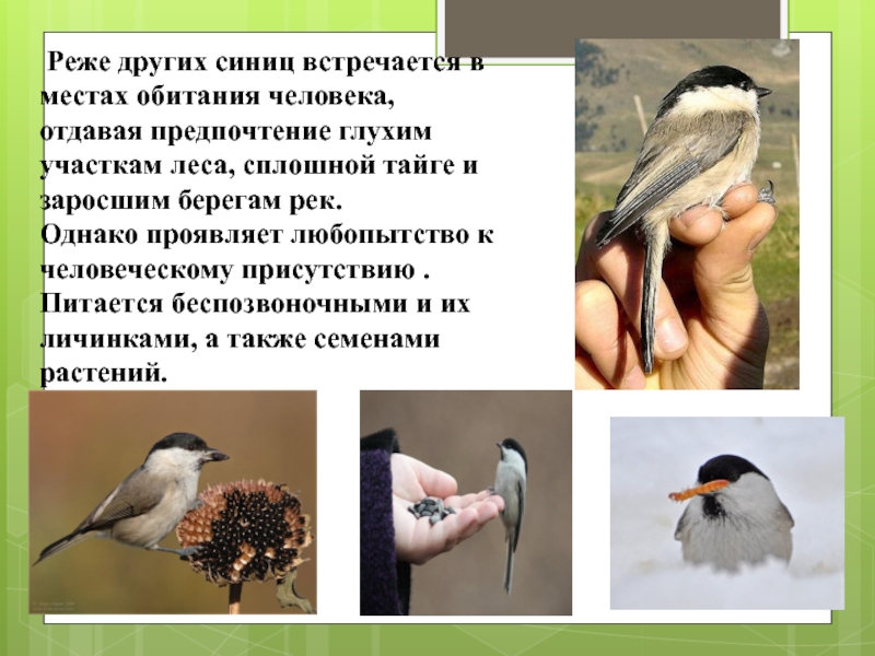 Слайд 14 Реже других синиц встречается в местах обитания человека, отдавая предпочтение