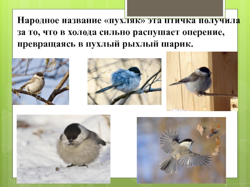 Слайд 11Народное название «пухляк» эта птичка получила за то, что в холода