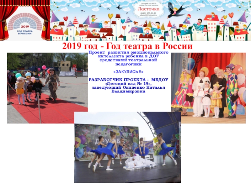2019 год - Год театра в РоссииПроект развития эмоционального интеллекта ребенка в ДОУ средствами театральной педагогики «ЗАКУЛИСЬЕ»    РАЗРАБОТЧИК ПРОЕКТА - МБДОУ «Детский сад № 19», заведующий Осипенко Наталья Владимировна