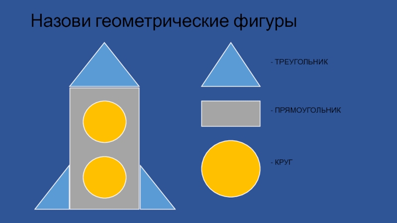Назови геометрические фигуры- ТРЕУГОЛЬНИК- ПРЯМОУГОЛЬНИК- КРУГ