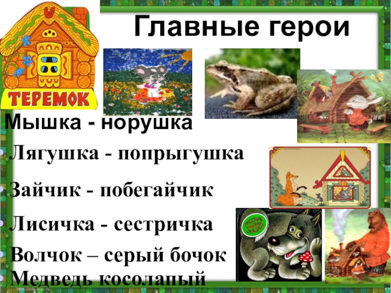 Главные героиМышка - норушка Лягушка - попрыгушка Зайчик - побегайчик Лисичка - сестричка Волчок – серый бочок