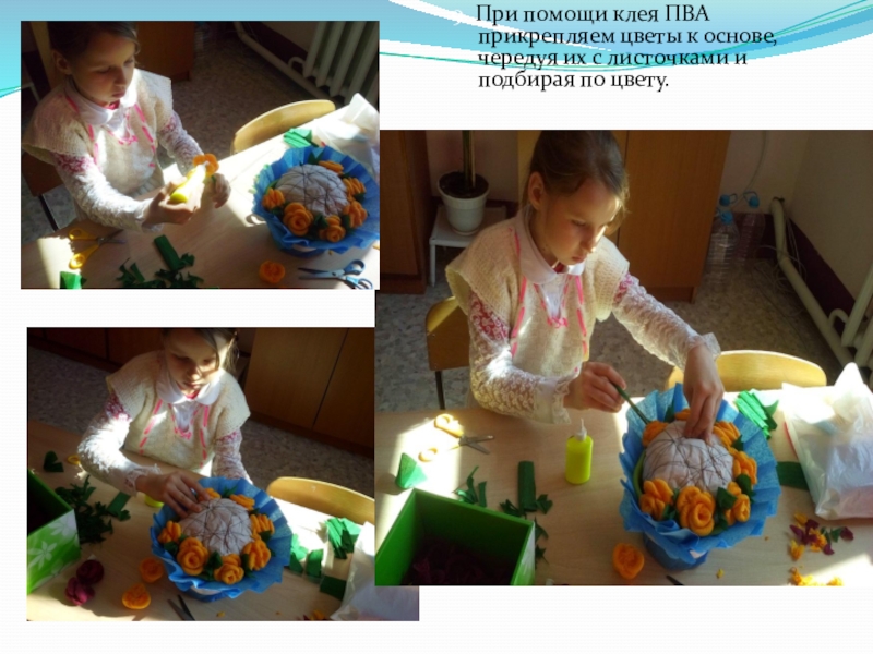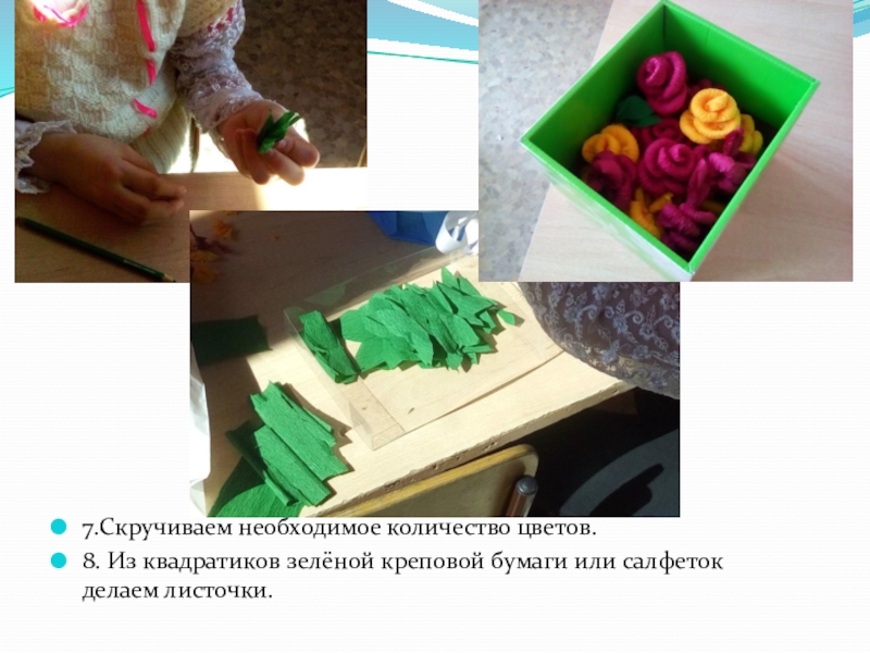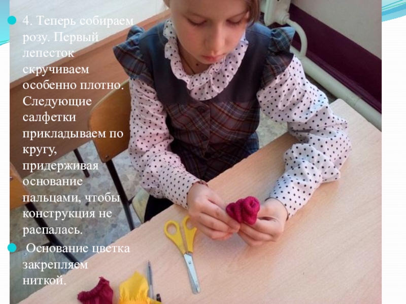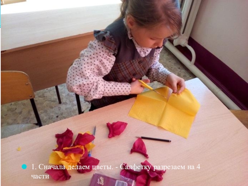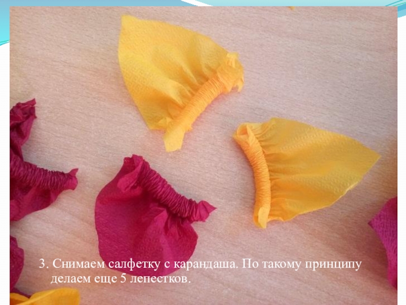 2. Каждый, полученный кусочек салфетки накрутить на карандаш, чтобы остался «хвостик» для скрепления лепестков между собой.