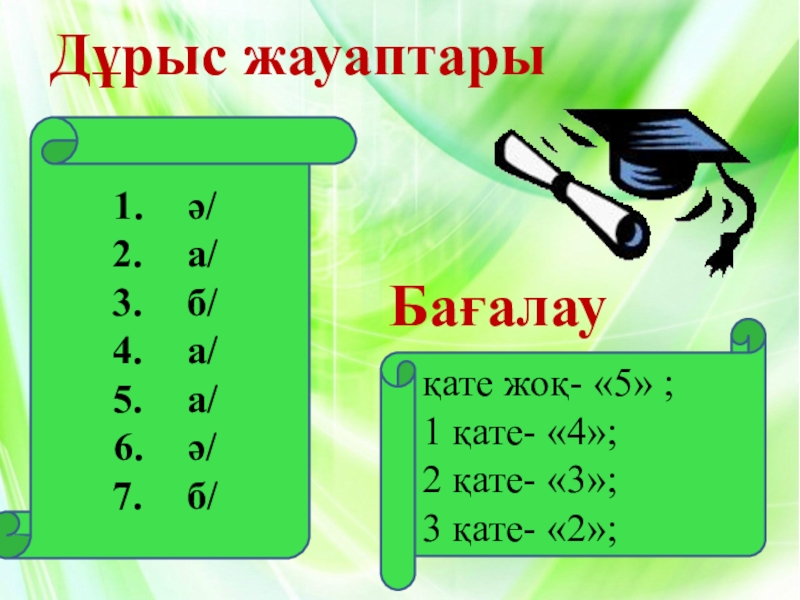 ә/а/б/а/а/ә/б/Дұрыс жауаптарыБағалауқате жоқ- «5» ;1 қате- «4»;2 қате- «3»;3 қате- «2»;
