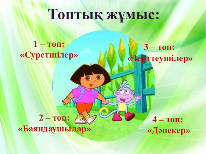 Топтық жұмыс:1 – топ: «Суретшілер»3 – топ: «Зерттеушілер»2 – топ: «Баяндаушылар»4 – топ: «Дәнекер»