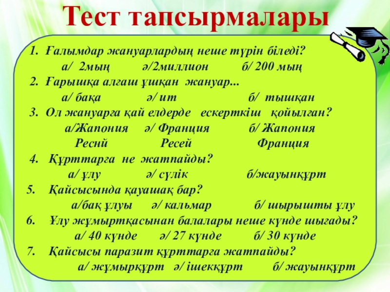 Тест тапсырмалары1. Ғалымдар жануарлардың неше түрін біледі? а/ 2мың ә/2миллион б/ 200 мың2. Ғарышқа алғаш ұшқан жануар... а/ бақа