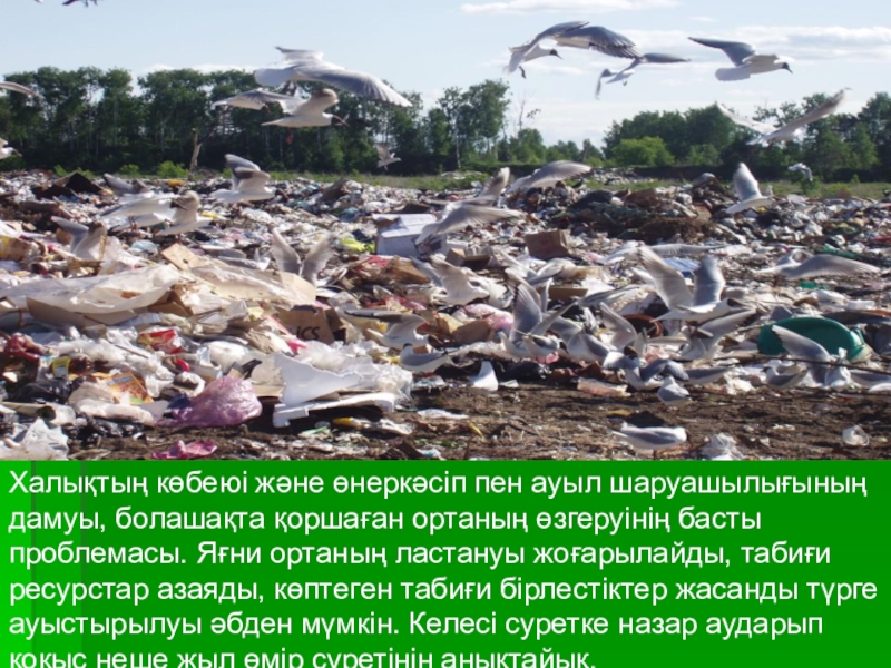 Слайд 19Халықтың көбеюі және өнеркәсіп пен ауыл шаруашылығының дамуы, болашақта қоршаған ортаның
