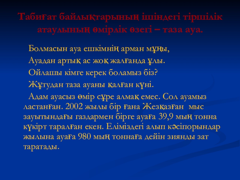 Адам ауасыз өмір сұре алмақ емес. Сол ауамыз ластанған. 2002 жылы бір ғана Жезқазған мыс зауытындағы газдармен бірге ауаға 39,9 мың тонна күкірт таралған екен. Еліміздегі алып кәсіпорындар жылына ауаға 980 мың тоннаға дейін зиянды зат таратады.