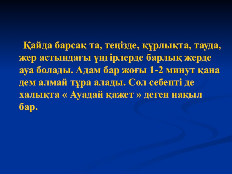 астындағы үңгірлерде барлық жерде ауа болады. Адам бар жоғы 1-2 минут қана дем алмай тұра алады. Сол себепті де халықта « Ауадай қажет » деген нақыл бар.