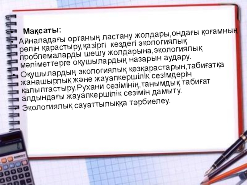 экологиялық проблемаларды шешу жолдарына,экологиялық мәліметтерге оқушылардың назарын аудару.