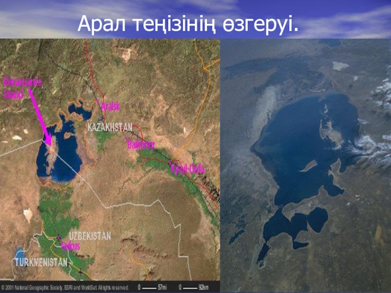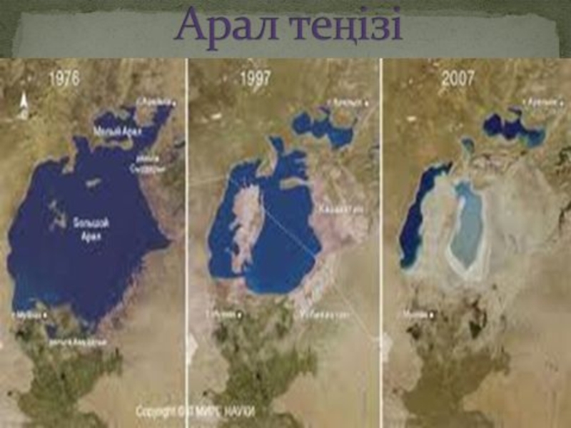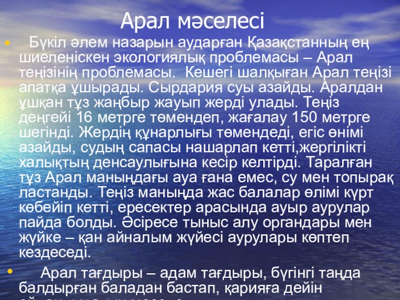 Бүкіл әлем назарын аударған Қазақстанның ең шиеленіскен экологиялық проблемасы – Арал теңізінің проблемасы. Кешегі шалқыған Арал теңізі апатқа ұшырады. Сырдария суы азайды. Аралдан ұшқан тұз жаңбыр жауып жерді улады. Теңіз деңгейі 16 метрге төмендеп, жағалау 150 метрге шегінді. Жердің құнарлығы төмендеді, егіс өнімі азайды, судың сапасы нашарлап кетті,жергілікті халықтың денсаулығына кесір келтірді. Таралған тұз Арал маныңдағы ауа ғана емес, су мен топырақ ластанды. Теңіз маныңда жас балалар өлімі күрт көбейіп кетті, ересектер арасында ауыр аурулар пайда болды. Әсіресе тыныс алу органдары мен жүйке – қан айналым жүйесі аурулары көптеп кездеседі.