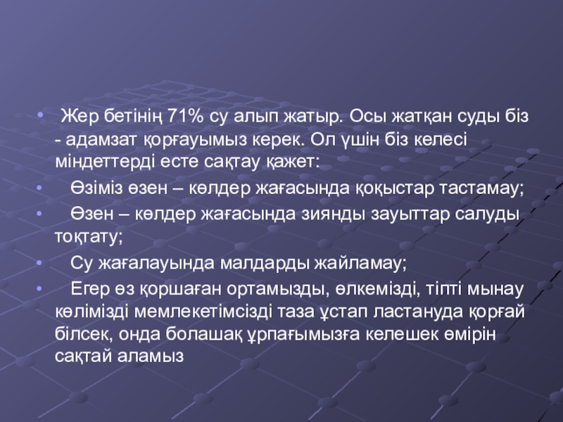 Слайд 15 Жер бетінің 71% су алып жатыр. Осы жатқан суды біз