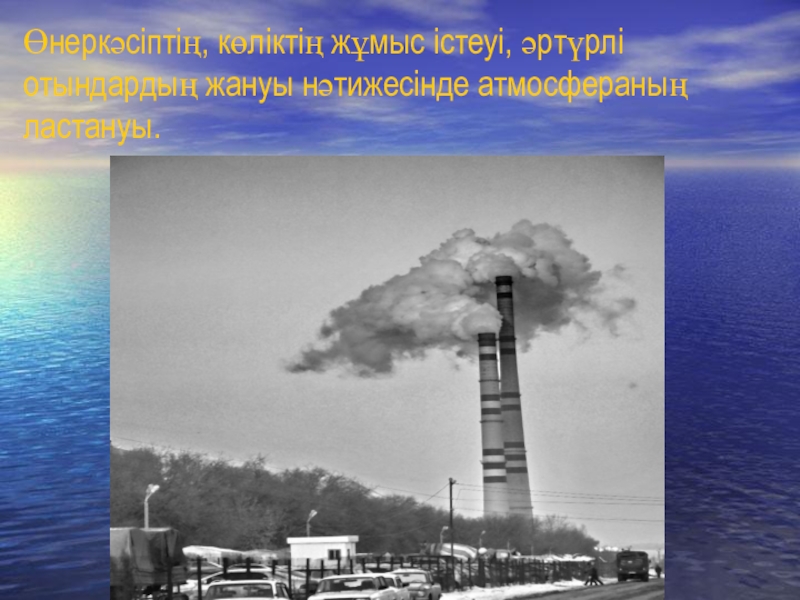 Слайд 26Өнеркәсіптің, көліктің жұмыс істеуі, әртүрлі отындардың жануы нәтижесінде атмосфераның ластануы.