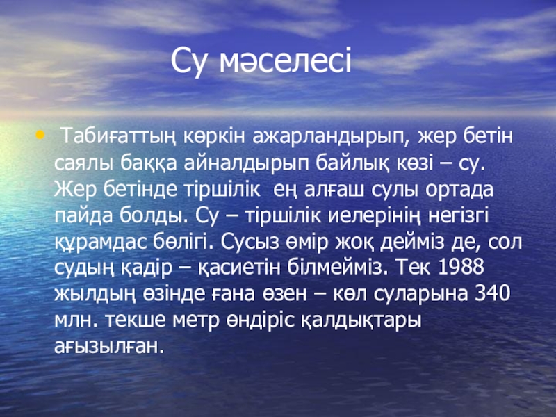 көркін ажарландырып, жер бетін саялы баққа айналдырып байлық көзі – су. Жер бетінде тіршілік ең алғаш сулы ортада пайда болды. Су – тіршілік иелерінің негізгі құрамдас бөлігі. Сусыз өмір жоқ дейміз де, сол судың қадір – қасиетін білмейміз. Тек 1988 жылдың өзінде ғана өзен – көл суларына 340 млн. текше метр өндіріс қалдықтары ағызылған.