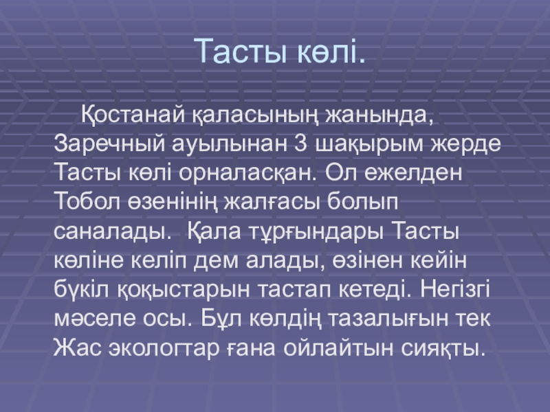 шақырым жерде Тасты көлі орналасқан. Ол ежелден Тобол өзенінің жалғасы болып саналады. Қала тұрғындары Тасты көліне келіп дем алады, өзінен кейін бүкіл қоқыстарын тастап кетеді. Негізгі мәселе осы. Бұл көлдің тазалығын тек Жас экологтар ғана ойлайтын сияқты.