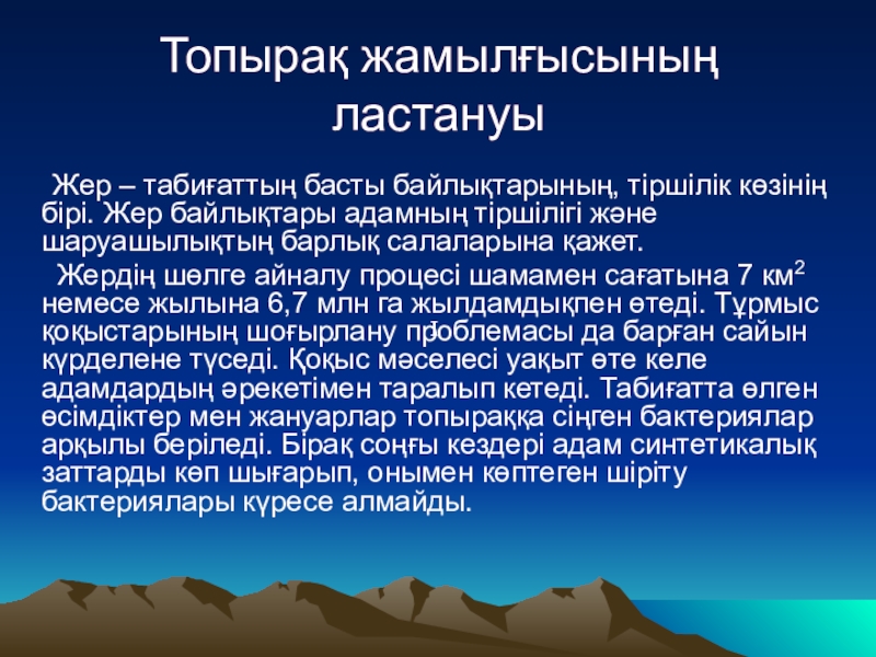 Жердің шөлге айналу процесі шамамен сағатына 7 км2 немесе жылына 6,7 млн га жылдамдықпен өтеді. Тұрмыс қоқыстарының шоғырлану проблемасы да барған сайын күрделене түседі. Қоқыс мәселесі уақыт өте келе адамдардың әрекетімен таралып кетеді. Табиғатта өлген өсімдіктер мен жануарлар топыраққа сіңген бактериялар арқылы беріледі. Бірақ соңғы кездері адам синтетикалық заттарды көп шығарып, онымен көптеген шіріту бактериялары күресе алмайды.