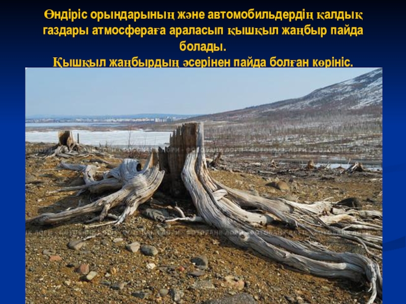 Слайд 27Өндіріс орындарының және автомобильдердің қалдық газдары атмосфераға араласып қышқыл жаңбыр пайда