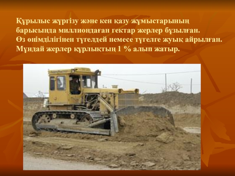 Слайд 21Құрылыс жүргізу және кен қазу жұмыстарының барысында миллиондаған гектар жерлер бұзылған.