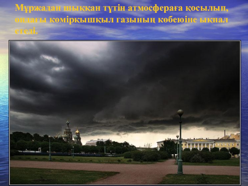 Слайд 28Мұржадан шыққан түтін атмосфераға қосылып, ондағы көмірқышқыл газының көбеюіне ықпал етеді.