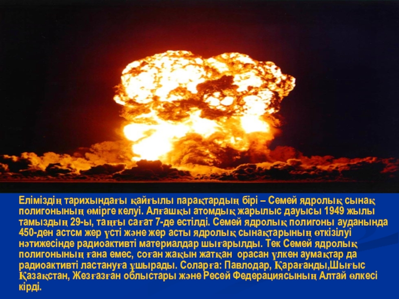 сынақ полигонының өмірге келуі. Алғашқы атомдық жарылыс дауысы 1949 жылы тамыздың 29-ы, таңғы сағат 7-де естілді. Семей ядролық полигоны ауданында 450-ден астсм жер үсті және жер асты ядролық сынақтарының өткізілуі нәтижесінде радиоактивті материалдар шығарылды. Тек Семей ядролық полигонының ғана емес, соған жақын жатқан орасан үлкен аумақтар да радиоактивті ластануға ұшырады. Соларға: Павлодар, Қарағанды,Шығыс Қазақстан, Жезғазған облыстары және Ресей Федерациясының Алтай өлкесі кірді.