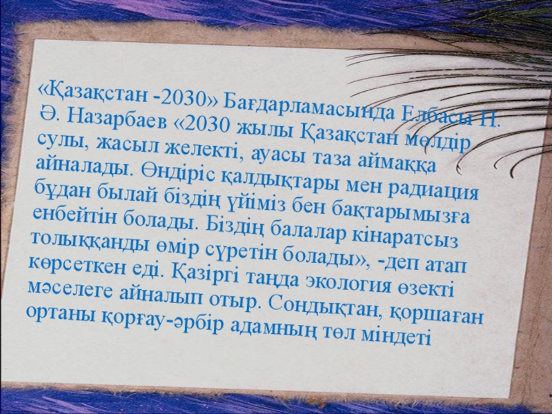 «Қазақстан -2030» Бағдарламасында Елбасы Н.Ә. Назарбаев «2030 жылы Қазақстан мөлдір